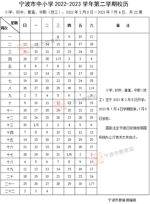 2022-2023学年第二学期,小学、初中、普高、中职(技工)定于2023年2月8日开学;2023年7月4日学期结束,7月5日放假,共22周。