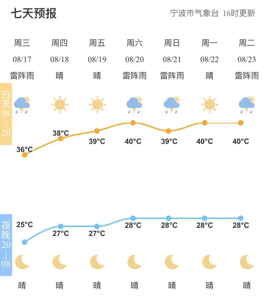 明天雷阵雨范围缩小,是晴到多云午后局部雷阵雨的天气。未来五天仍是副热带高压占据甬城地盘,高温常驻,雷阵雨偶有来扰。受雷阵雨影响,浙江部分地区的高温强度略有缓和,最高气温有望回到35℃~37℃。好好珍惜这两天三字头的清凉,气象预报显示,从周四8月18日开始,40℃+的高温又要一连串。![]()