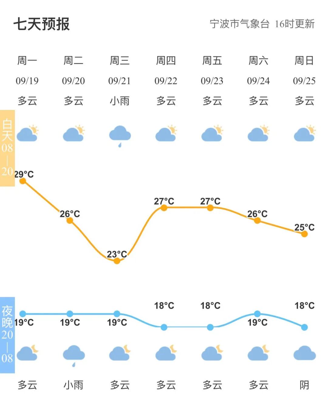 今天白天的最高气温在29℃左右,随着弱冷空气的不断扩散影响,本周早晚的凉意会明显起来,“1”字头的气温也将纷纷现身,早出晚归的朋友可带件薄外套。白天气温回升,但也都在“2”字头,体感上较为舒适。