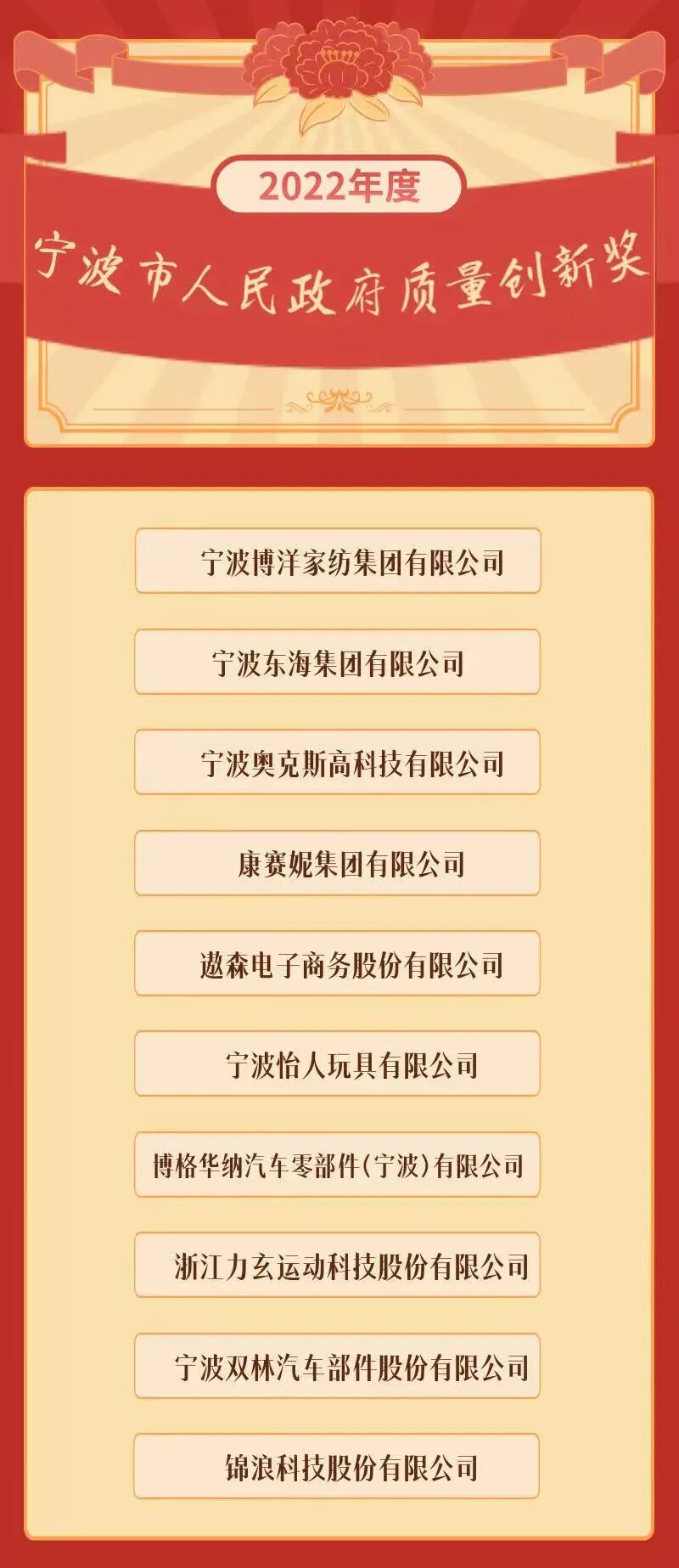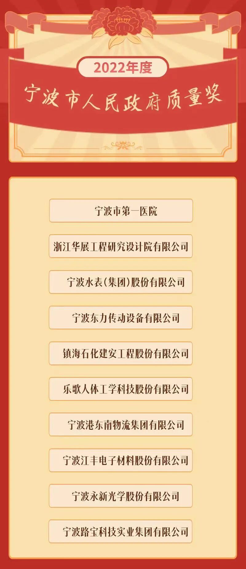 日前,宁波市人民政府发布《关于表彰2022年宁波市人民政府质量奖和质量创新奖获奖组织的通报》,授予宁波市第一医院等10家单位“2022年宁波市人民政府质量奖”,宁波博洋家纺集团有限公司等10家单位“2022年宁波市人民政府质量创新奖”。