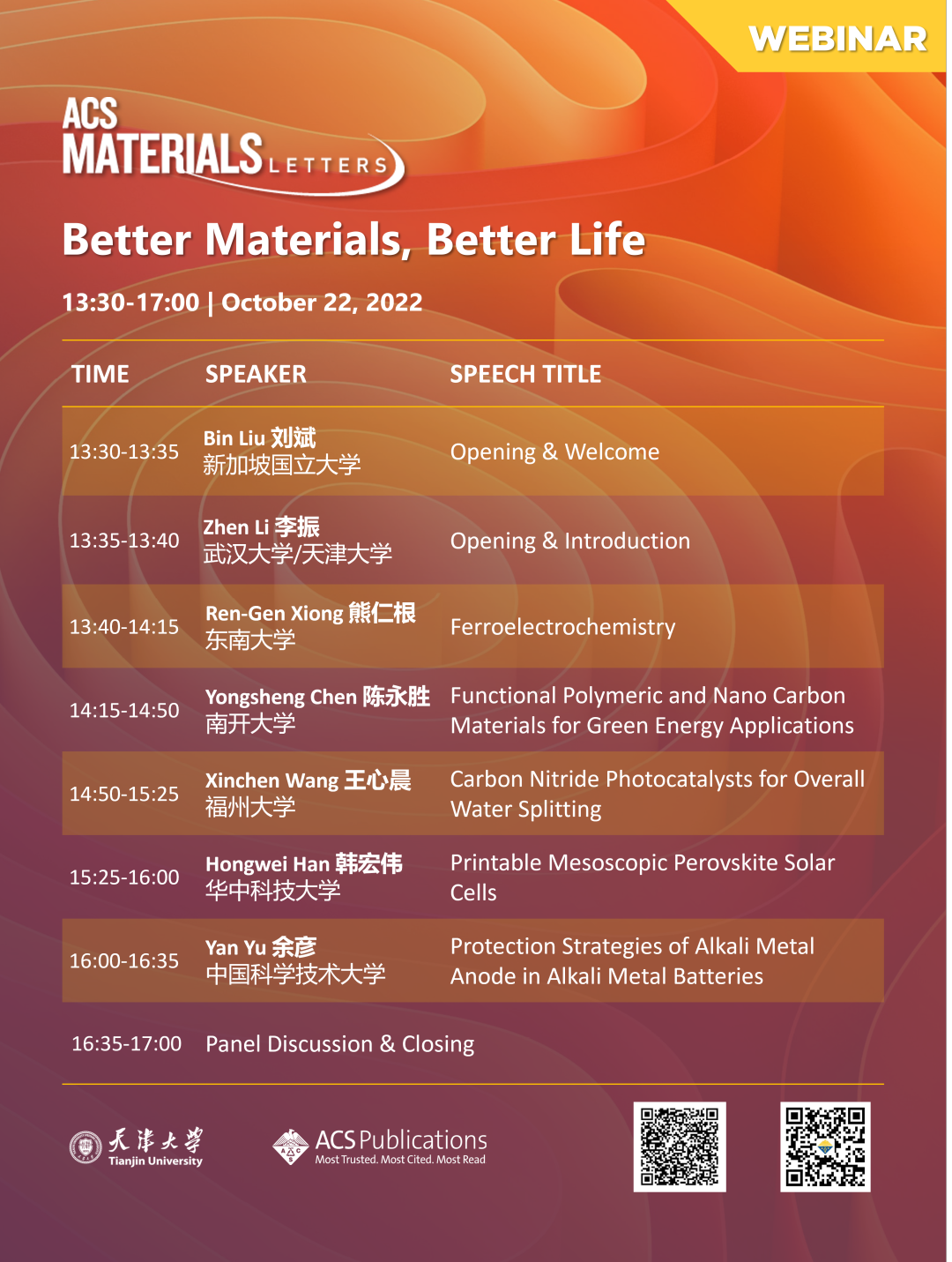 ACS Materials Letters 执行主编刘斌教授、武汉大学/天津大学李振教授共同组织此次研讨会,邀请东南大学熊仁根、南开大学陈永胜、福州大学王心晨、华中科技大学韩宏伟、中国科学技术大学余彦五位教授为大家带来“Better Materials, Better Life”主题学术研讨会。