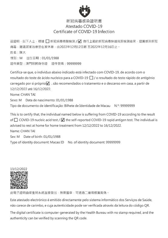 为免新冠病毒感染者仅因需要取得医生证明而就诊,造成医疗服务挤兑,影响真正有就诊需要人士的医疗服务,澳门卫生局向感染者以自动化及电子化方式发出“新冠病毒感染证明书”。