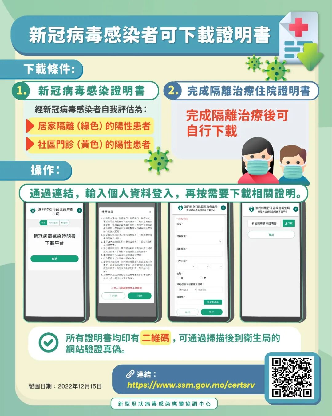 新冠病毒感染证明书下载平台网址:https://www.ssm.gov.mo/certsrv