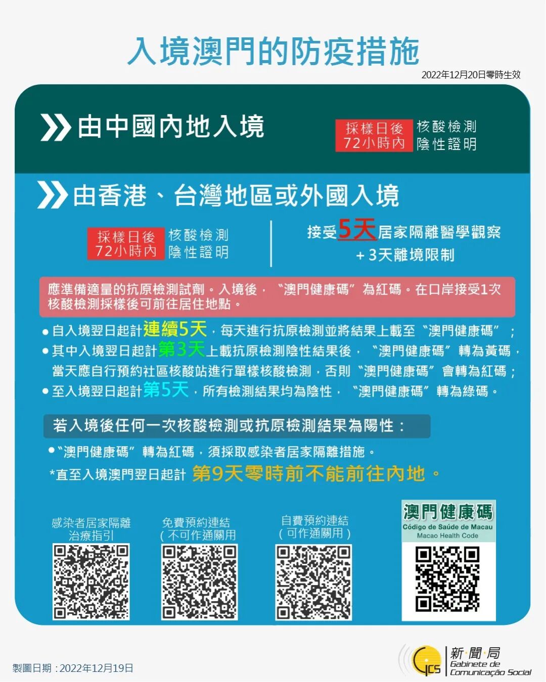 12月20日起澳门取消有关内地风险区的规定; 由中国内地(除广东省珠海市外)直接来澳,或由香港特别行政区、台湾地区及外国来澳人士,于登机、登船或登车时,须持采样日后72小时内核酸检测阴性证明 ,其他防疫措施要求不变。