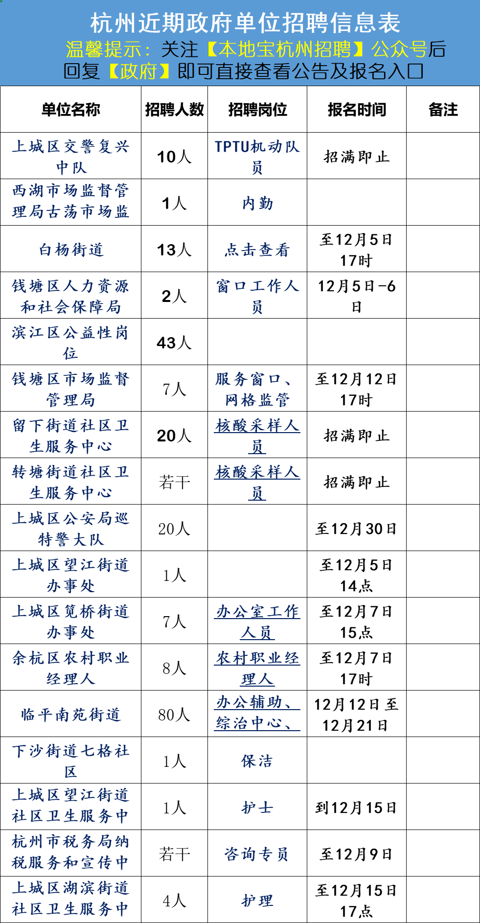 报名方式:进入本地宝杭州招聘公众号,首页对话框回复【政府】,即可查看临平区南苑街道及上城区公安局巡特警大队招聘报名方式及完整公告