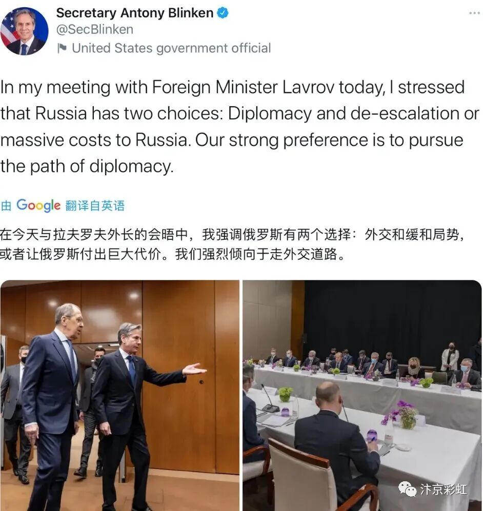 昨天,美国国务卿布林肯与俄罗斯外交部长在瑞士会谈,布林肯没有给俄罗斯多长的对话时间,整个会谈还不到两个小时就结束了。会谈后还没有等媒体把会谈的结果报出来,美国国务卿布林肯通过自媒体在散谈后第一时间发在了网上。布林肯表示,当前局势,俄罗斯只有两个选择,要么回归外交渠道并缓和局势;要么付出巨大的代价!其他的不用再白费口舌,不会让俄罗斯小算盘打成。