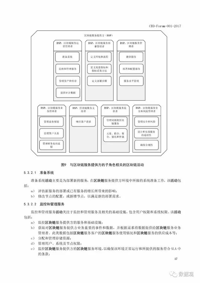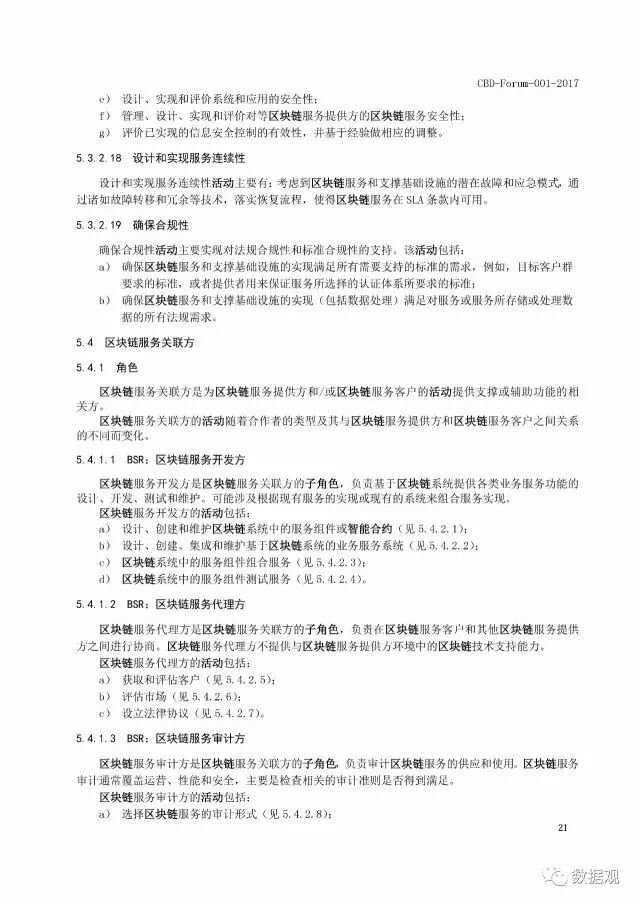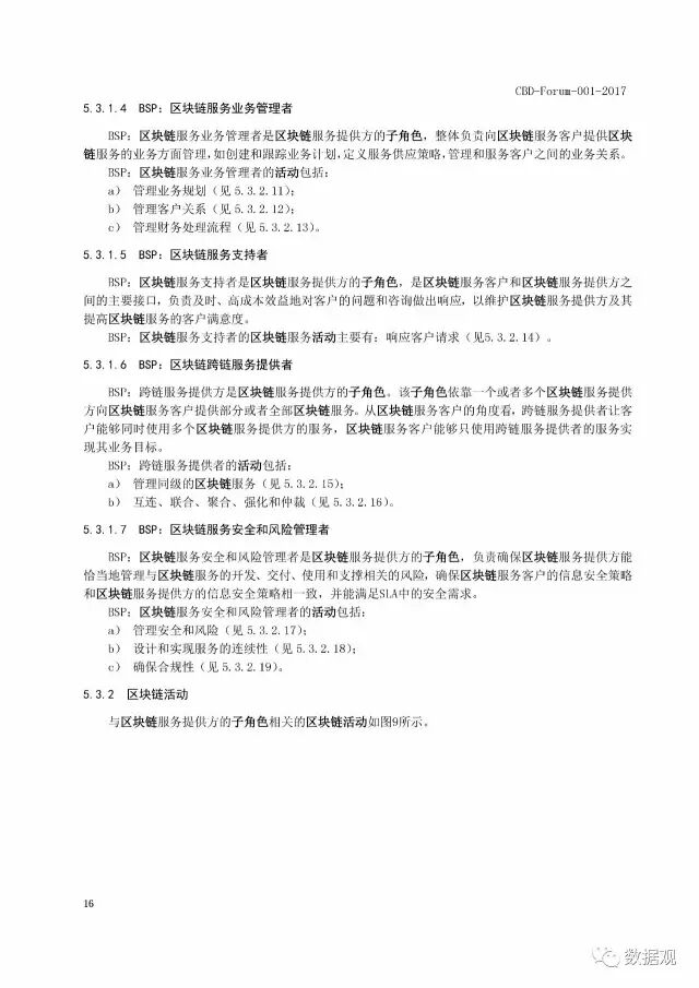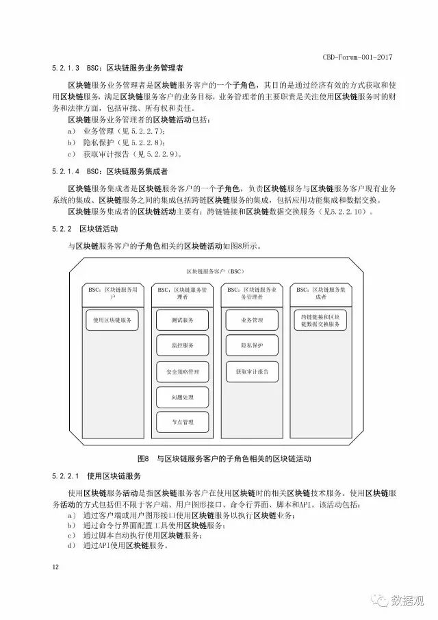 标准给出了区块链和分布式账本技术的重要术语和定义,并对两者之间的关系进行讨论。在用户视图中规定了区块链服务客户(BSC)、区块链服务提供方(BSP)和区块链服务关联方(BSR)三种角色,并且描述了这三种角色下的十五个子角色以及它们的活动。