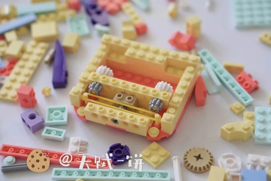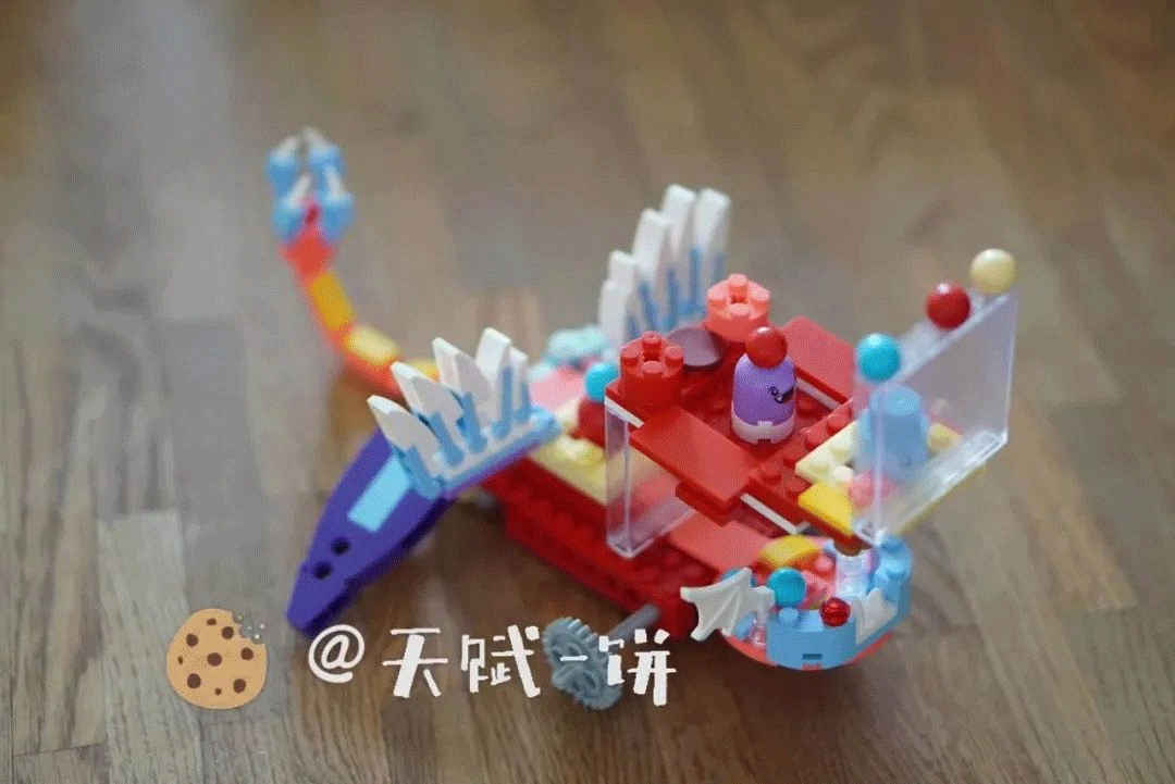 这也是我喜欢小怪兽系列的原因之一,在拼搭过程中,你可以看到机械装置是如何运动的。等全部搭好了,只要娃想,也可以随时拆开或打开盖子,观察齿轮咬合、链条传动等机械部件。比如地鼠机的后盖打开,可以清晰地看到凸轮的机械结构。这感觉,就像小时候打开了音乐盒的后盖,看到里面钢针跳动的“机械美”的治愈感。有人一定想问,小怪兽系列的5款玩具,可以拼出5个游戏机,但拼完了,也玩腻了,然后呢?