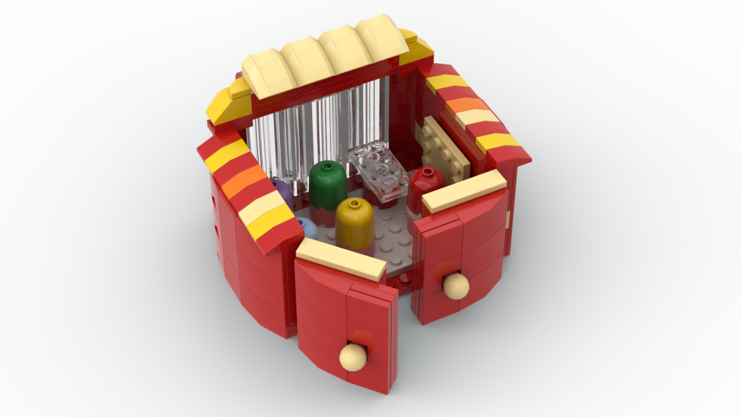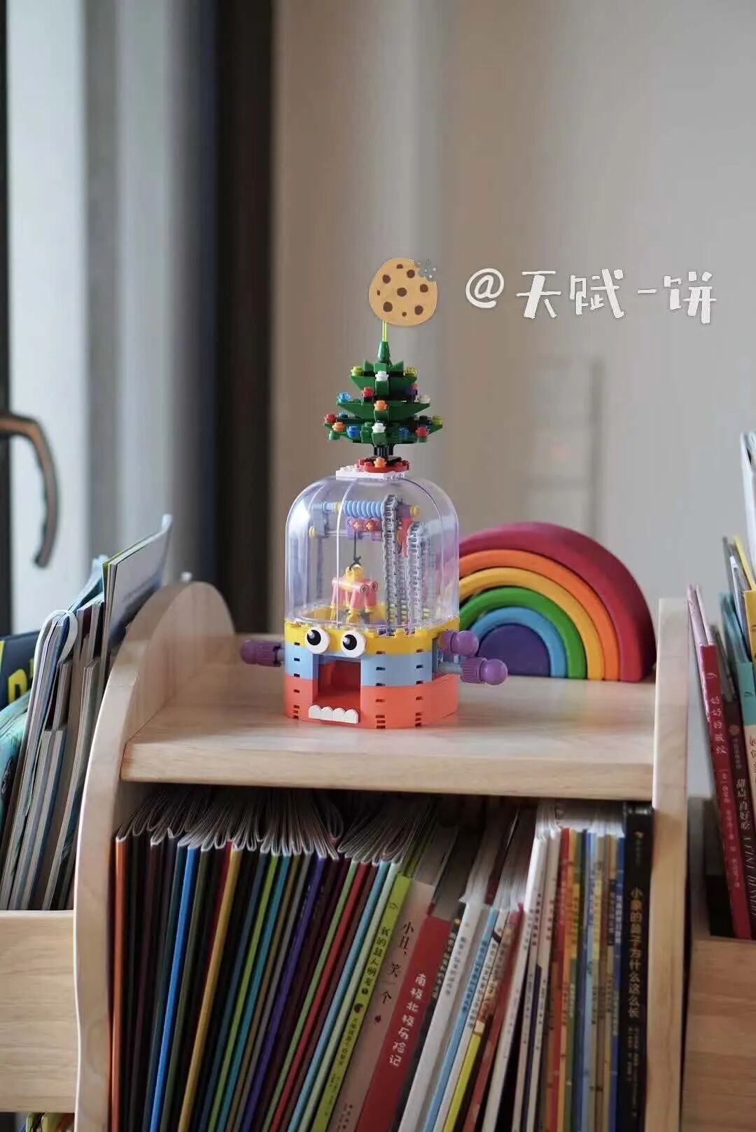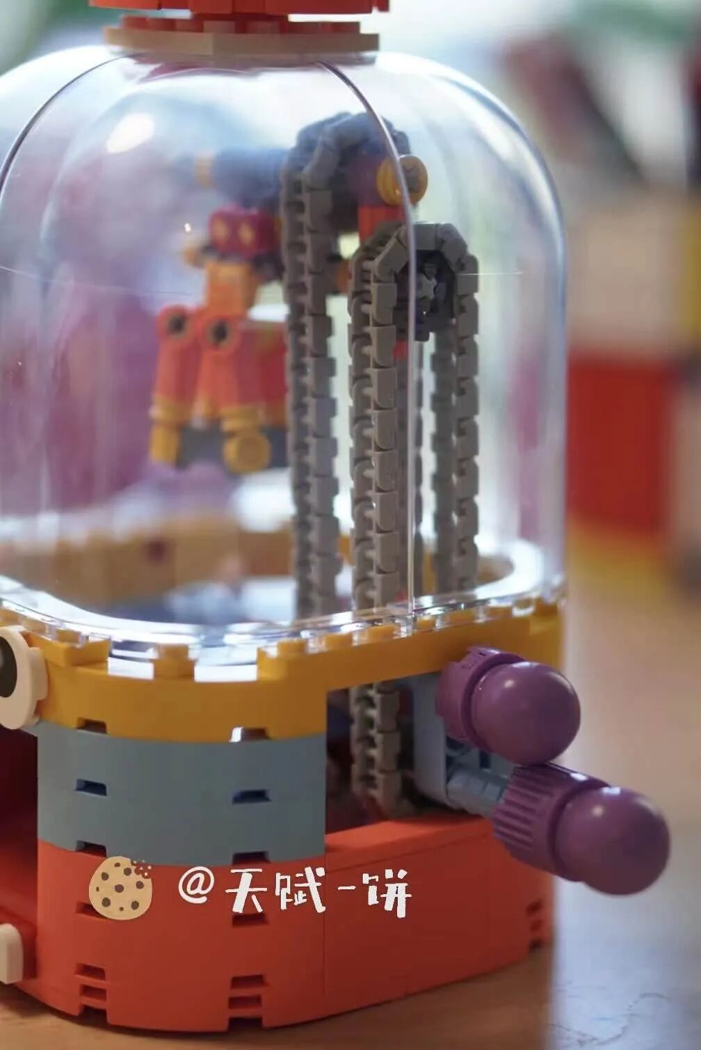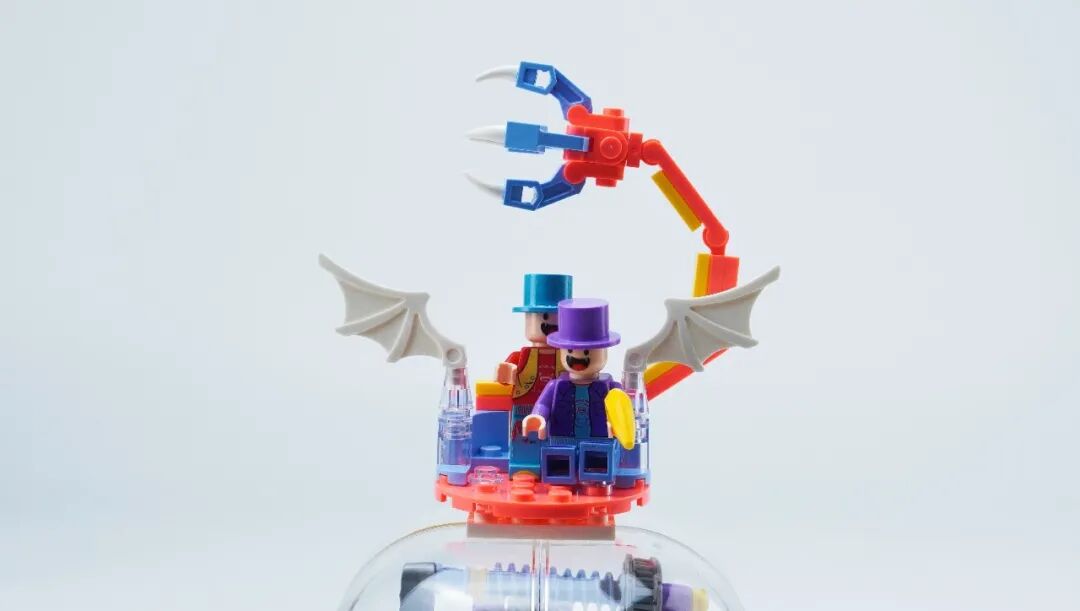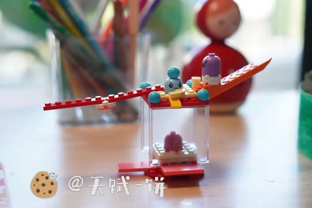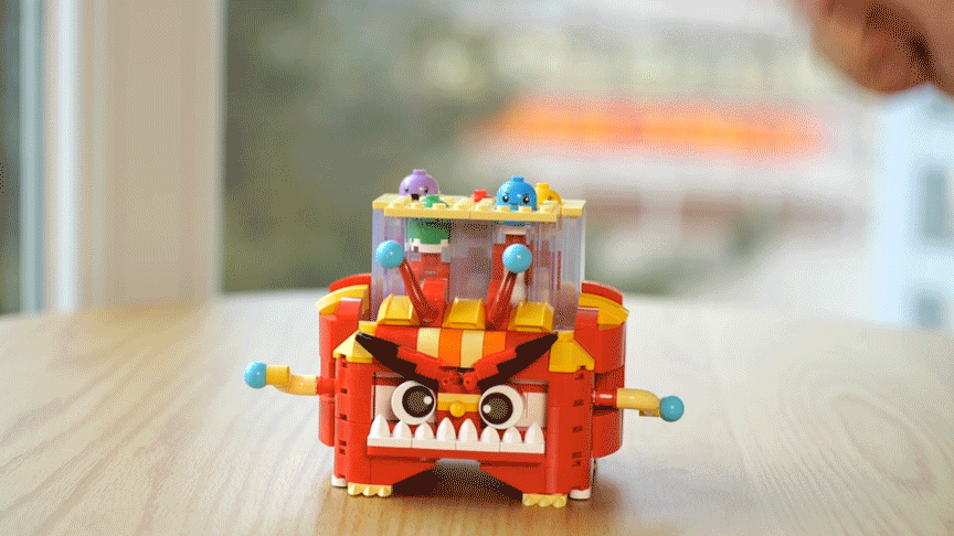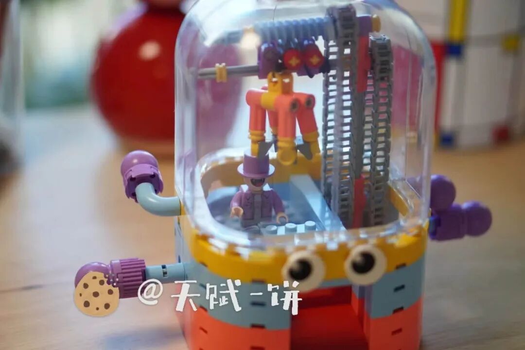 当然也可能中途掉落或没抓上,模拟真实情景下抓娃娃的场景,技术和运气成分都有一些。娃娃机顶部的人偶,其实也可以放进娃娃机里抓,或者换成娃自己喜欢的装饰,这部分可以让娃自由创造发挥。(圣诞树是我自己买的乐高,不包含在大头娃娃机内)