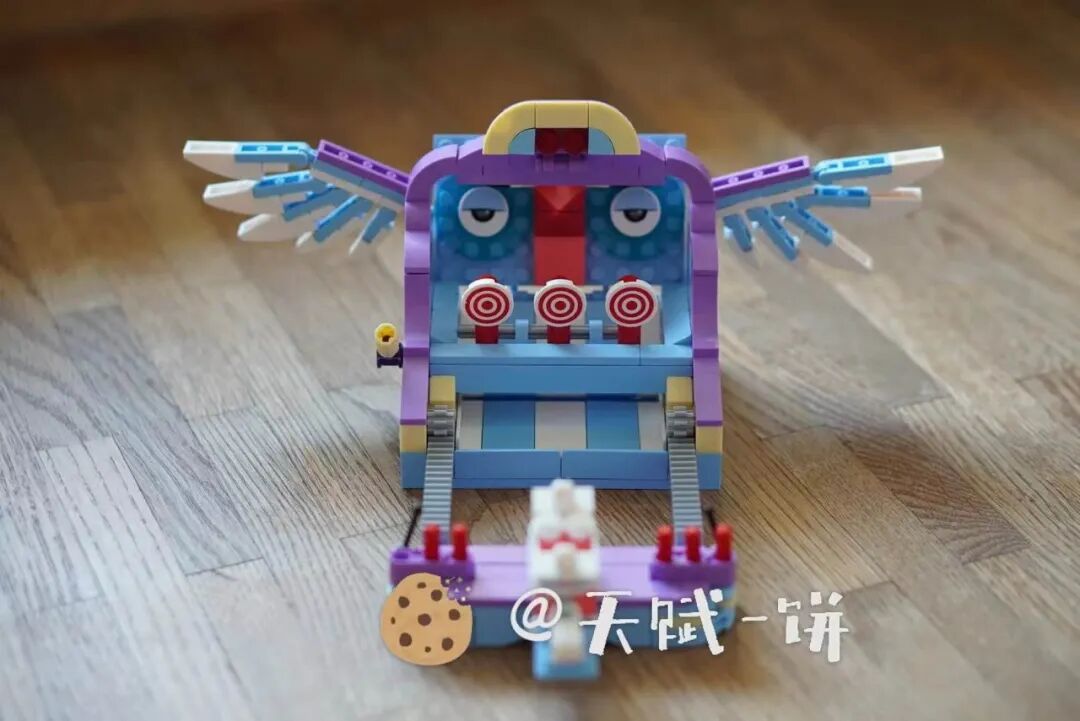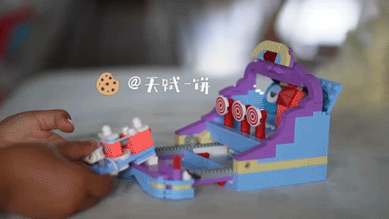 启动机关,发射弹珠,按压按钮,弹珠进了小怪兽的嘴里!掌声响起来!小怪兽的肚子,是一个深藏功与名的设计,相当于是弹珠收纳空间。不玩的时候,弹珠就收纳在小怪兽肚子里,不用担心丢到沙发底下不见了。包含270多个小颗粒,尺寸15.5*11*9.5cm射击场是五款中,拼搭过程相对简单的一个,不过玩的时候需要一定技巧。靶子被击中就会倒下,看着挺简单,其实没那么容易打中的。饼饼不会看准星,打到是碰运气,操作起来还是有一点技术门槛的。射击场背板是倾斜环绕的设计,只要不是偏得太夸张,子弹都会被挡在射击场里,回到下面的收纳位上(蓝白条相间的地方)。齿条传动的机械装置,可以调整射击的远近距离,玩的时候拉开,合上之后方便收纳,玩的时候打开。五款怎么选,这真的是一个灵魂拷问。
