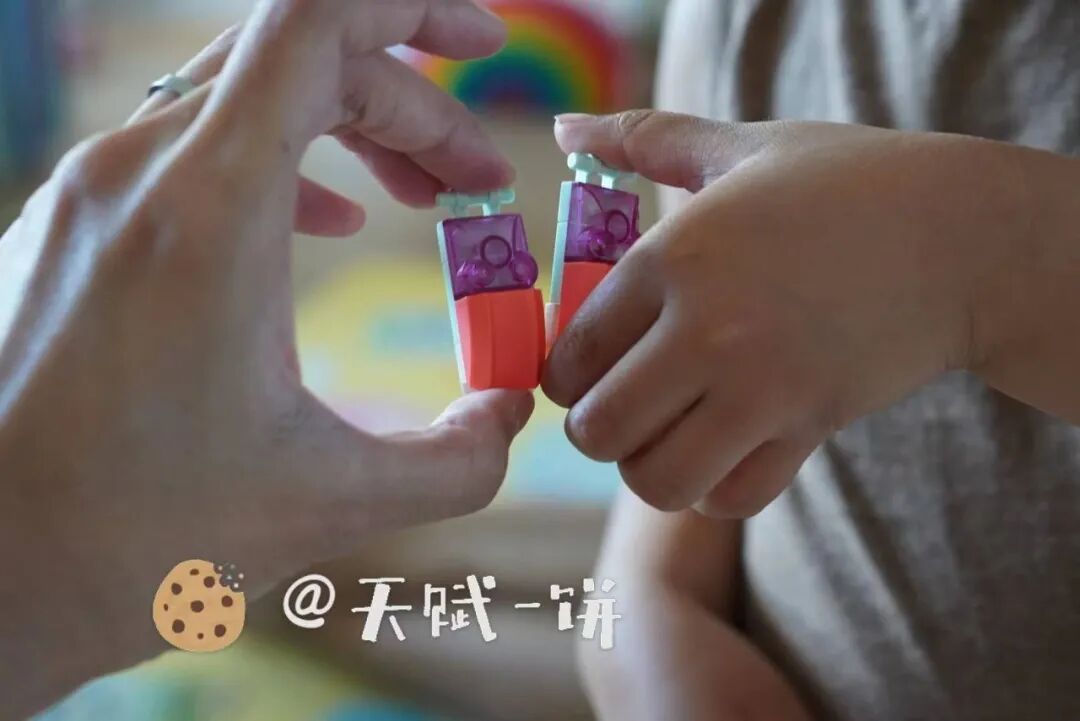 饼饼4岁多,自己拼肯定不行的,所以,我和队友主力拼,她来打下手,帮(倒)忙。小怪兽系列玩具的很多部位是对称的,需要成对儿成对儿地拼零件,这是非常好的让娃帮忙顺带学习的机会。我先挑出来会用到的组件,饼饼跟着我一点点拼起来,拼出相同两个零件,然后安在造型上,一点点参与完成这么一个大项目,她很有成就感。和饼饼一起拼的时候,我真的比她还兴奋,忍不住惊呼,我靠,居然还能这样弄?!