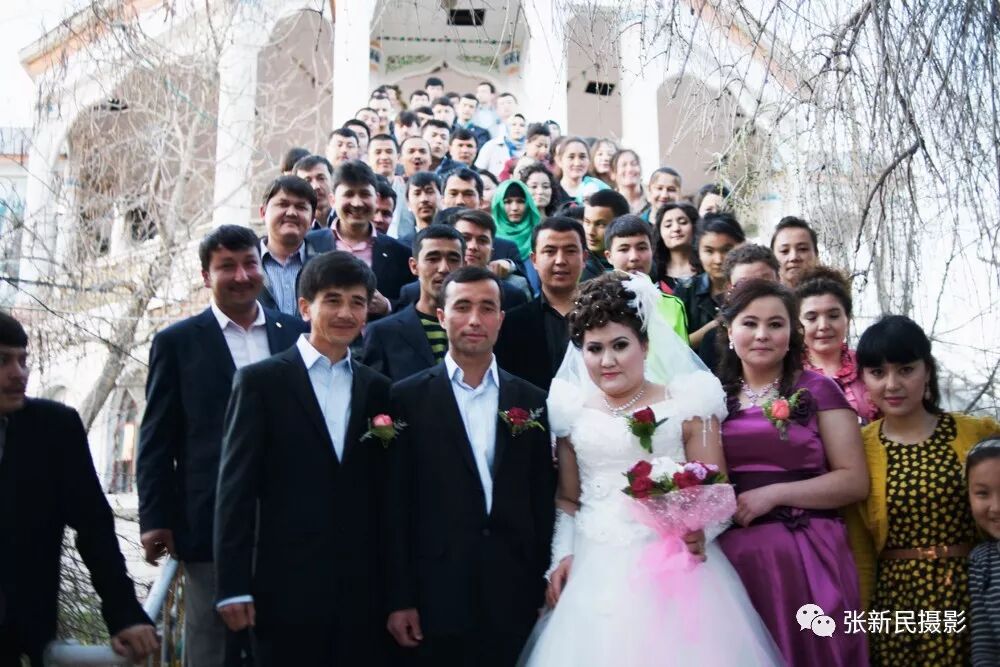 公园里有一个二楼凉亭,在那里跳一阵欢快的麦西莱普,然后在楼梯上排成两排欢迎新人,再合影一张,是伊宁市维吾尔族婚礼的传统浪漫的一个环节。