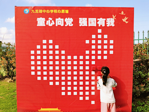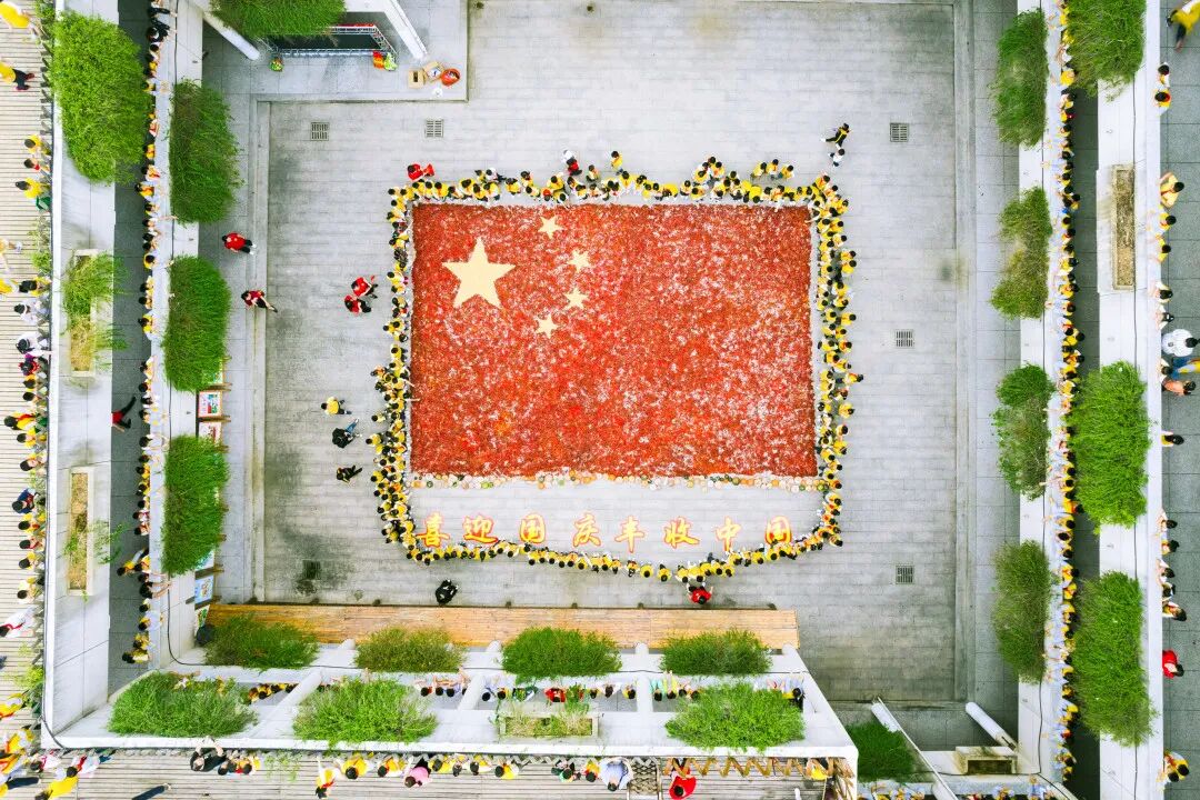 长兴县画溪街道包桥中心小学的同学们别出心裁,他们用自己亲手播种并收获的红辣椒、玉米铺成96平方米的巨幅国旗,并将祝福祖国的话语贴在“心愿墙”上,祝愿祖国繁荣昌盛。