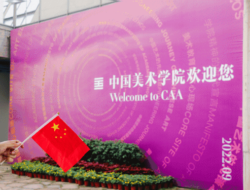 中国美术学院的同学们手持五星红旗,与校园建筑合影,感受个人前途与国家命运的同频共振。