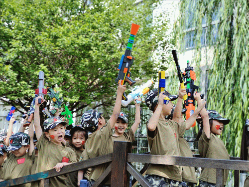 嵊州市开发区幼儿园的孩子们身着迷彩服,以情境性体验的方式,将红军爬雪山过草地的革命元素融入到自主游戏中,通过搭城楼、唱红歌等一系列多元化活动感知生于华夏,何其有幸。