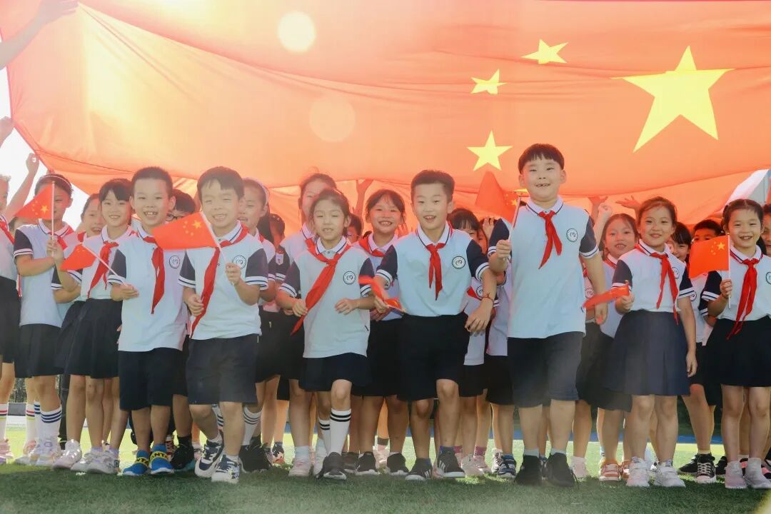 绿茵操场上,五星红旗冉冉升起,海宁经济开发区实验小学的一千多名师生共同唱响《童心向党》,学子向国旗敬礼、与国旗合影,将镜头定格在一张张灿烂的笑脸和鲜艳的国旗上。