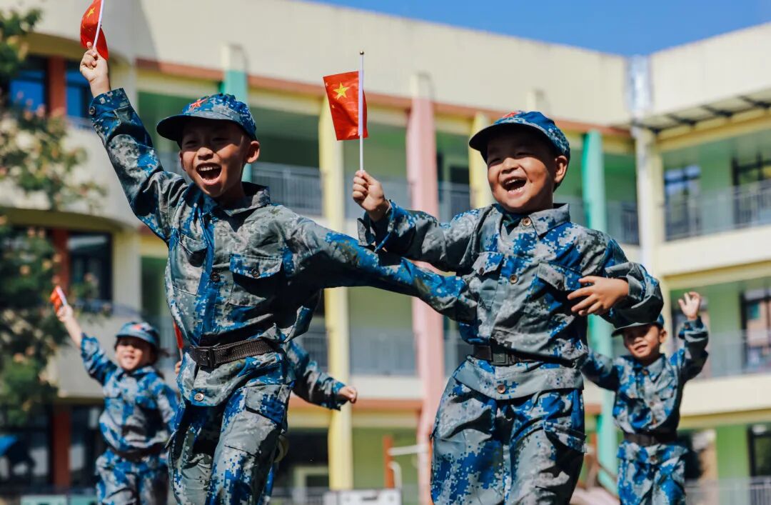 建德市乾潭中心幼儿园的孩子们穿上鲜艳的迷彩服,如同保家卫国的小战士。他们手挥红旗,可爱的笑容满怀对祖国的祝福。