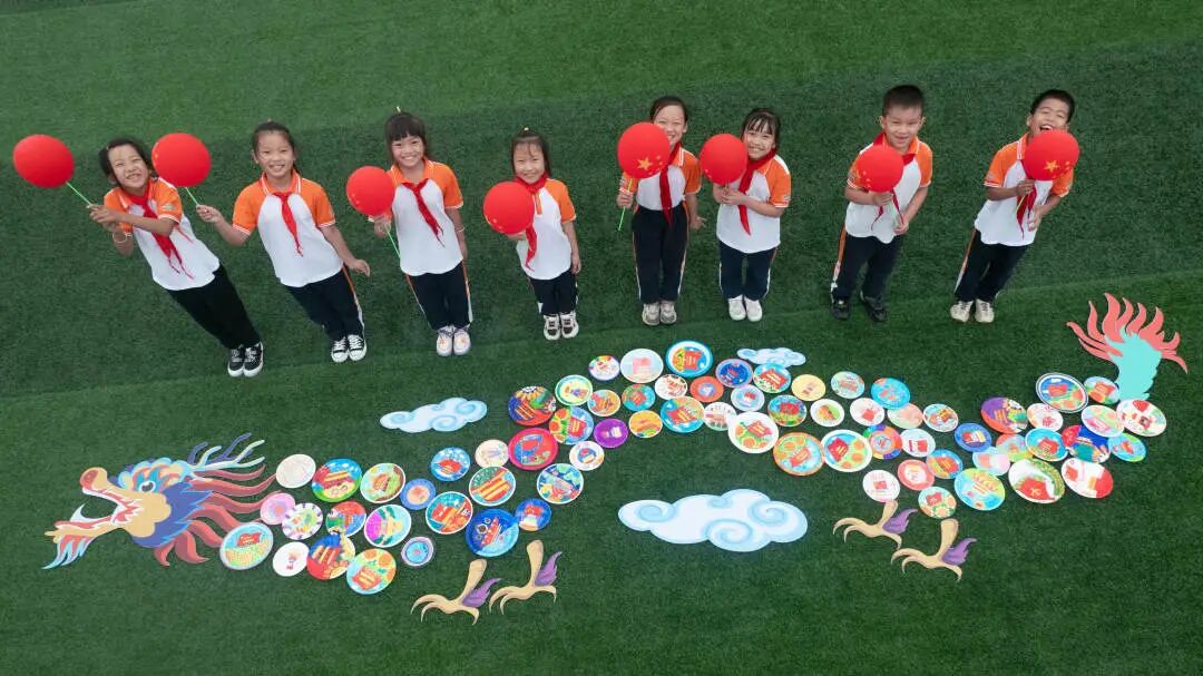 巧手迎国庆,拳拳爱国心,长兴县林城镇天平中心小学的孩子们绘制圆盘,并将它们拼接成一条“百愿龙”,象征着祖国这条东方巨龙正腾飞而起。