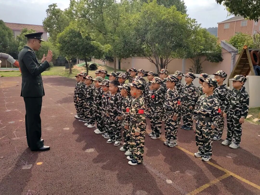诸暨市姚江镇直埠幼儿园邀请解放军叔叔向幼儿讲解国旗、国徽、国庆节的含义及由来,带小朋友开展军训和趣玩红色游戏等一系列活动。