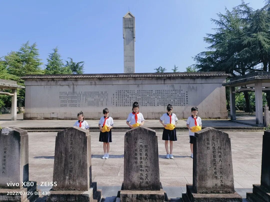 绍兴市柯桥区华舍小学五(7)中队红星小队的队员们来到柯桥区烈士陵园,开展缅怀先烈、致敬英雄的红色研学活动。队员们在纪念碑前默哀、敬礼,依次上前献上亲手制作的小白花,表达对英雄的哀思和敬仰。