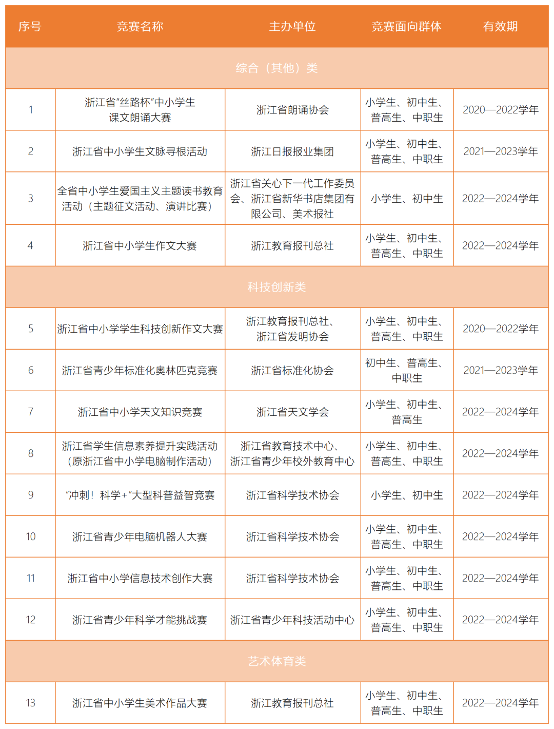 四、完善竞赛结果应用。任何竞赛奖项均不作为基础教育阶段招生入学加分依据或升学依据,严禁将各类竞赛获奖情况作为高中阶段学校招生考试(中考)加分依据,相关特长和表现等可以计入学生综合素质评价档案。