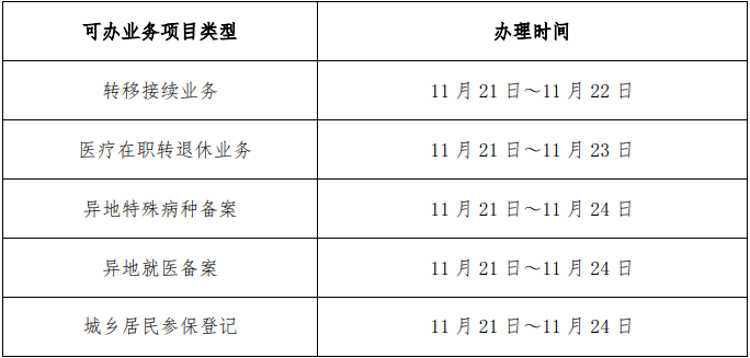 1.自11月18日起,陆续停止医疗保险登记征缴、城乡居民参保登记、转移接续、特殊权限、异地就医备案、异地特殊病等业务的受理。