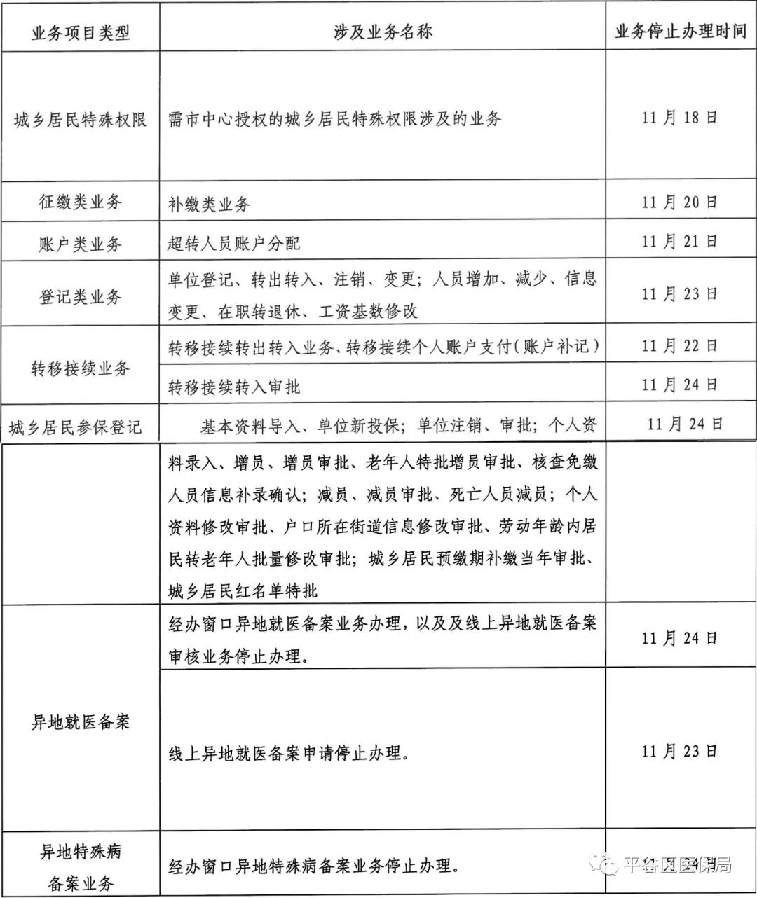 1.自11月18日起,陆续停止医疗保险登记征缴、城乡居民参保登记、转移接续、异地就医备案、异地特殊病等业务的受理,详情如下: