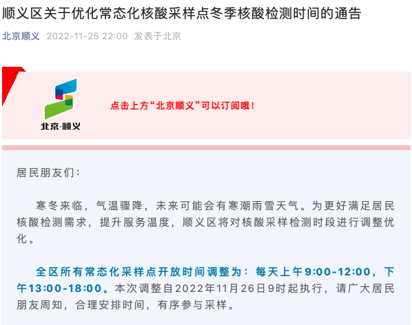 此前,顺义区11月25日也发布通告,优化常态化核酸采样点冬季核酸检测时间。