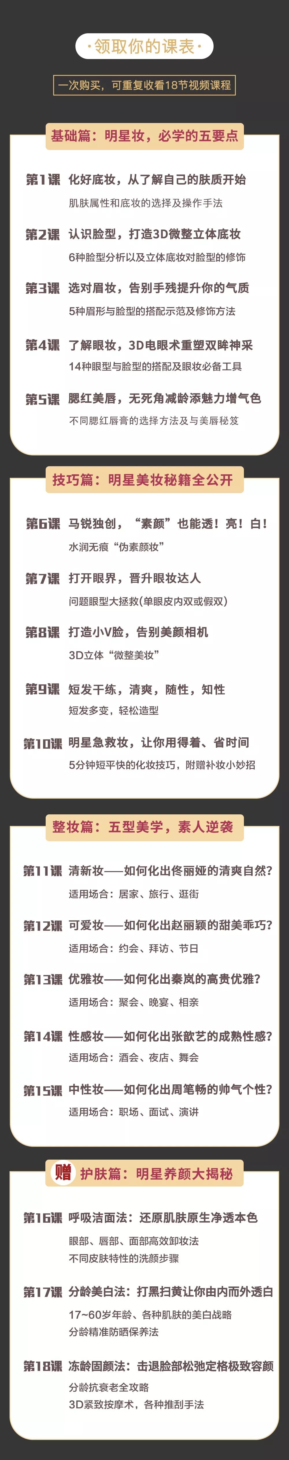 这套课程融合了我近几年线上线下的培训经验,在课程里,我也会把过去的十几年为明星的化妆护肤秘籍统统公开。