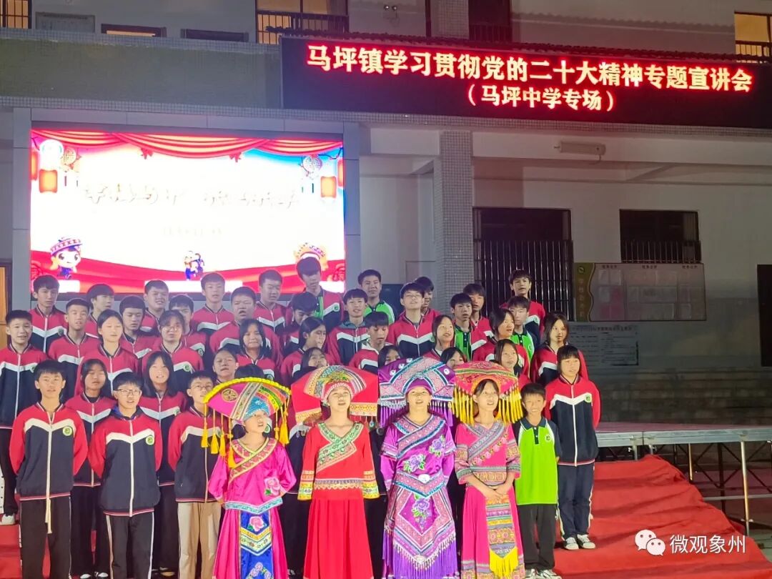 11月22日晚,在马坪中学的晚会上,壮欢歌王、象州县新时代宣讲团成员秦学依正在用壮欢向师生们宣讲党的二十大精神。