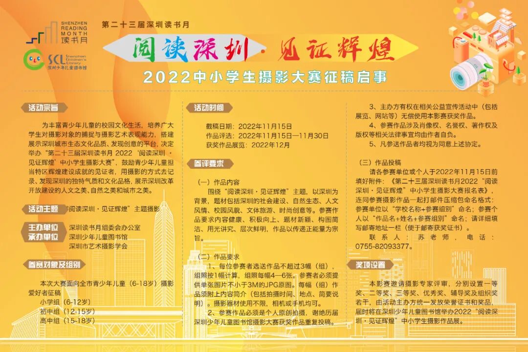 为丰富青少年儿童的校园文化生活,培养广大学生对摄影对象的捕捉与摄影艺术表现能力,搭建展示深圳城市生态文化品质、发现创意的平台,决定举办“第二十三届深圳读书月2022‘阅读深圳·见证辉煌’中小学生摄影大赛”,鼓励青少年儿童担当特区辉煌建设成就的见证者,用摄影的方式去记录、发现深圳的独特气质和文化品格,展示深圳改革开放建设的人文之美、自然之美和城市之美。