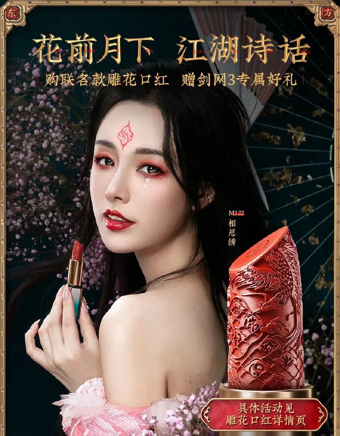 同时,花西子还与古风网游剑网3联名,推出了七夕限定「比翼相思雕花口红」,下单购买送价值2000通宝的《剑网3》易容专属代币。