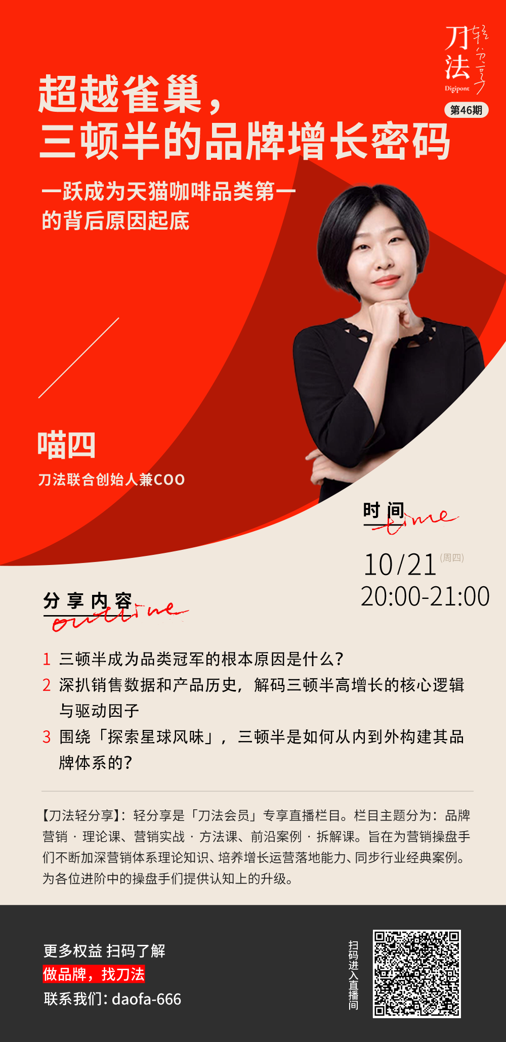 刀法联合创始人兼 COO 喵四,将于 10 月 21 日(周四)20:00-21:00,在刀法直播间为刀法会员(本次直播仅限刀法会员)展开更加完整的品牌解读及核心逻辑。