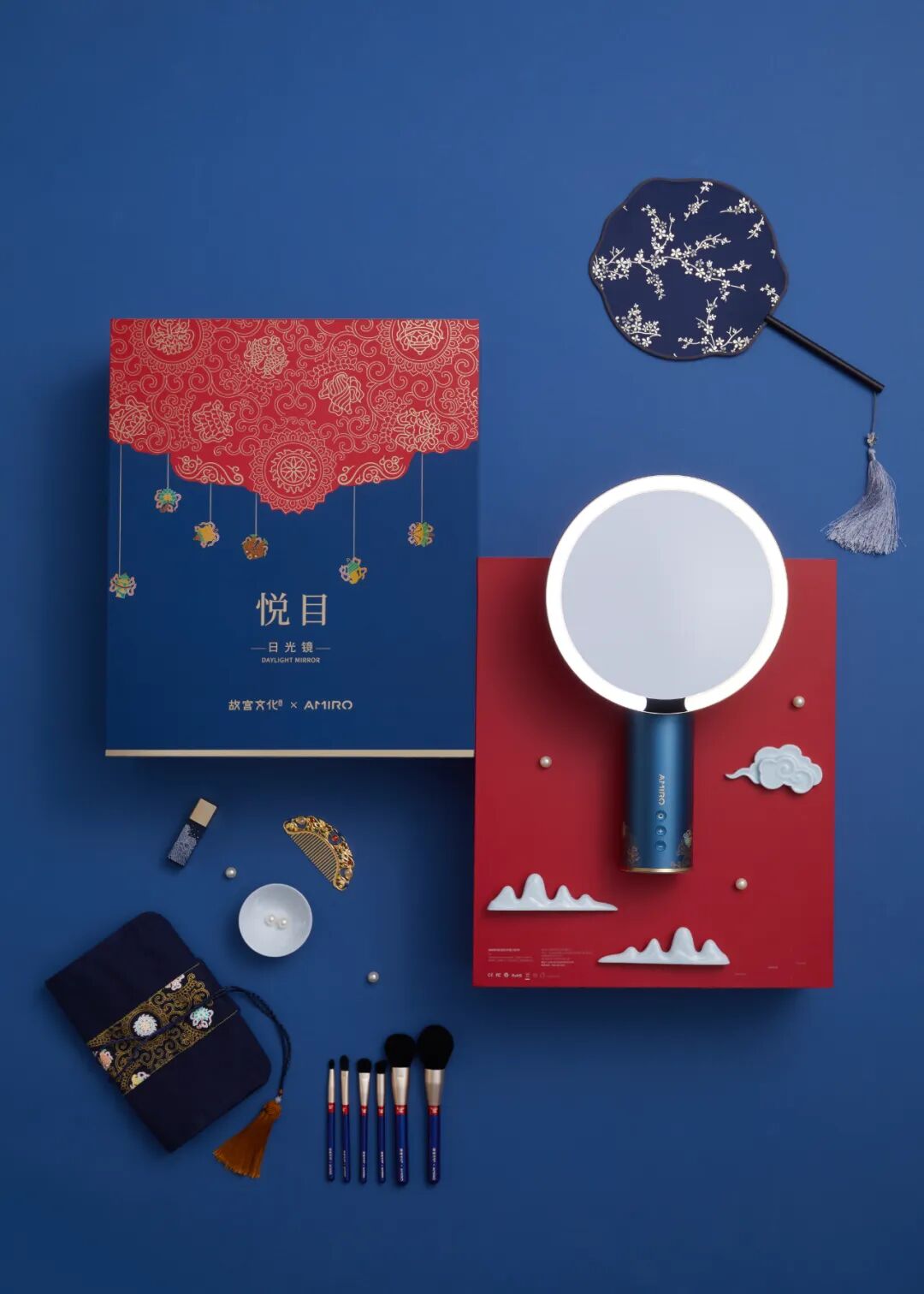 礼盒由定制的美妆镜和一套化妆刷组成,附故宫博物院盖章证书,限量 5000 份。其中,AMIRO 借中国古代八宝镜的概念,将故宫的砖红和景泰蓝相融合,设计出一款“悦目·日光镜”,作为展品登上“悦读故宫”主题展,吸引用户前往体验打卡,参与微博返图活动。
