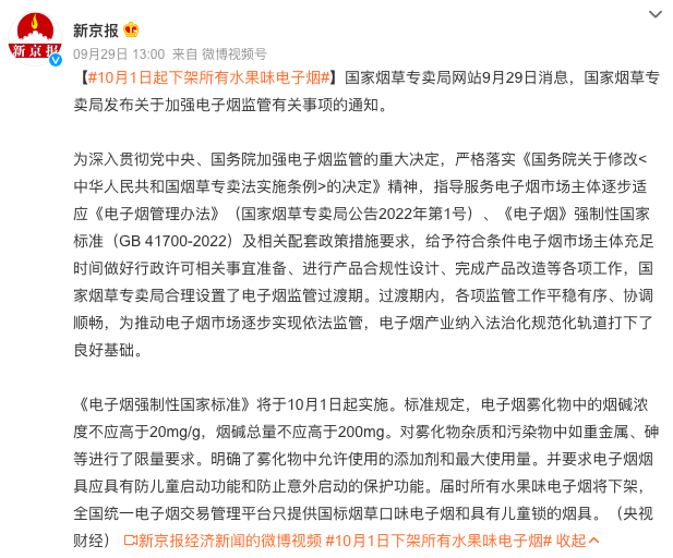 9 月 29 日,国家烟草专卖局发布关于加强电子烟监管有关事项的通知。2022 年 10 月 1 日 起,从事电子烟生产经营的电子烟市场主体应当取得烟草专卖许可证,严格按照《中华人民共和国烟草专卖法》及《电子烟管理办法》等强制性国家标准、国家烟草专卖局各项配套政策规定等开展生产经营活动。(新京报)