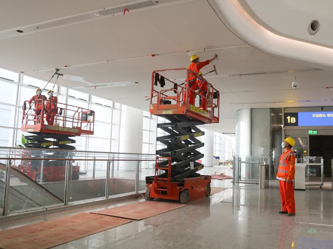 华铁旅服公司抽调7个分公司146名员工,投入38台专业设备对合杭高铁湖杭段杭州西、桐庐东等6个站的幕墙玻璃、站台、进出通道、候车室、厕所等重点区域实施开荒保洁,通过机械化+人工相结合的保洁模式,全力清洁站容站貌,达到新站开站标准,确保合杭高铁湖杭段高品质开通。