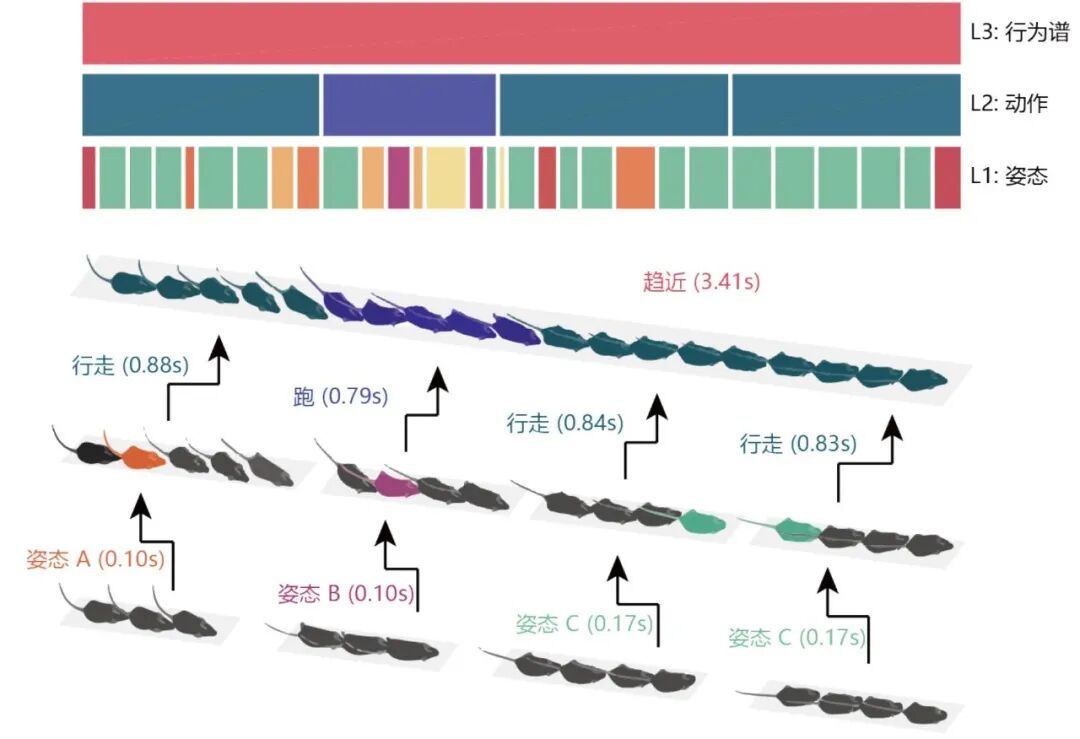 图3.小鼠行为的分层结构。在三层的行为结构中:最底层是动物在极短时间内由身体呈现的一种空间姿态(Pose);第二层是若干姿态动态变化时形成的一个动作单元(Movement);第三层是指由若干个动作完成的一次行为,多个行为则成为行为谱(Ethogram)。