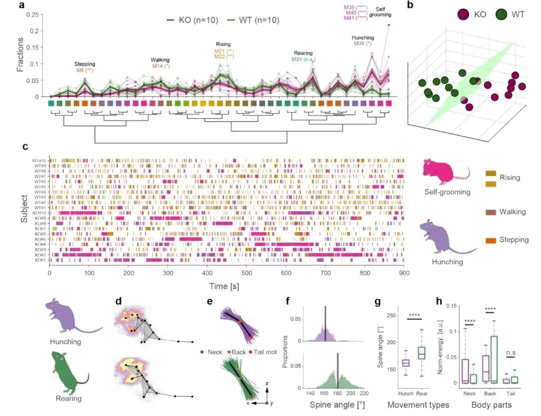 图4. Behavior Atlas鉴定小鼠自闭样刻板行为。a.Shank3B 敲除组(KO,n=10,深红色)和对照组(WT, n=10,绿色)小组自发行为的对比分析,发现两组之间存在8种行为存在差异;b.基于行为模块占比构建的20只小鼠的“自闭样行为空间”;c.8种具有差异的行为在实验中的时间分布。d-h 精细的三维运动学参数分析以证明Hunching与Rearing属于不同类型的行为。