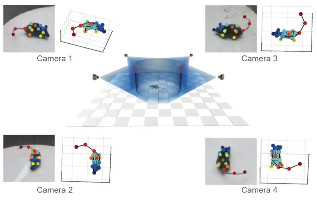 首先,针对传统行为学采集中单视角拍摄遇到的身体遮挡和视角偏差等问题,脑所团队自行研发了一种多视角三维行为轨迹重建技术(图2),实现了无需在动物身体上添加任何标记,就能精准、自动地获取动物的三维骨架,有效解决了遮挡和视角问题。