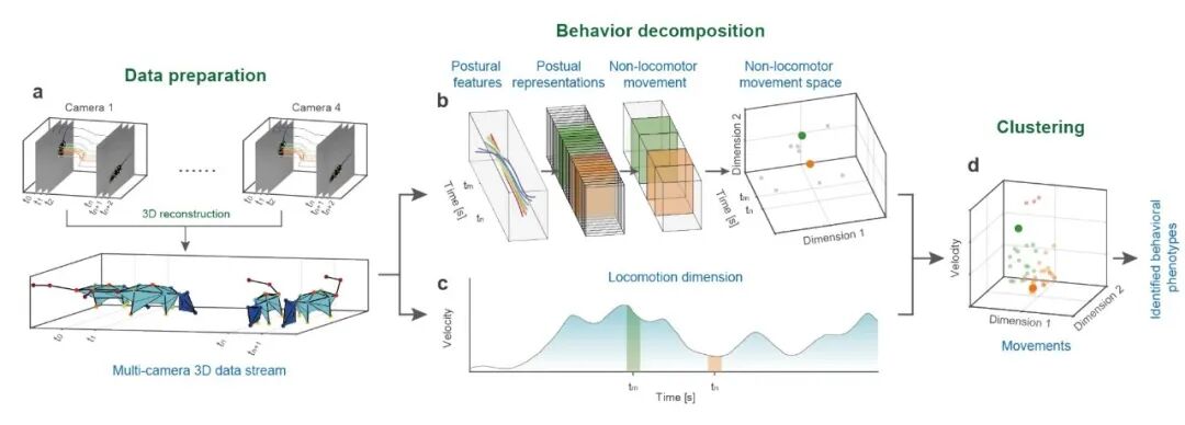 图1. Behavior Atlas行为分析框架。a.数据源:多相机三维重建构建动物身体骨架序列;b.逐层提取高维的non-locomotor movement(NM,非位移动作)特征,并对特征进行分解与二维表征;c.用于提取locomotion特征,计算NM片段的平均速度;d.对三维的行为特征空间进行无监督聚类,获得不同的行为类型。