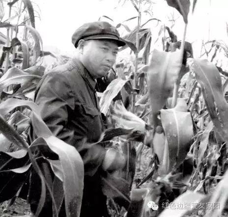 图7-5 颜文斌在玉米地里考察农情。当这位放牛娃出身的老兵面对一千多万亩兵团耕地的大农业生产管理任务时,其压力可想而知。他的办法是补课加用人。补课的方式除了学习和考察之外,还包括带头参加机关小农场的生产劳动。