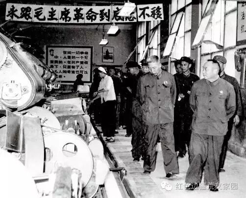 图7-6 颜文斌视察兵团机械厂。他的警卫员方秋生说:我跟着老头儿跑遍了兵团的所有的单位。别看他脾气大,但骂人分对象,挨他骂的都是军人,他从来不骂职工、知青和专家。