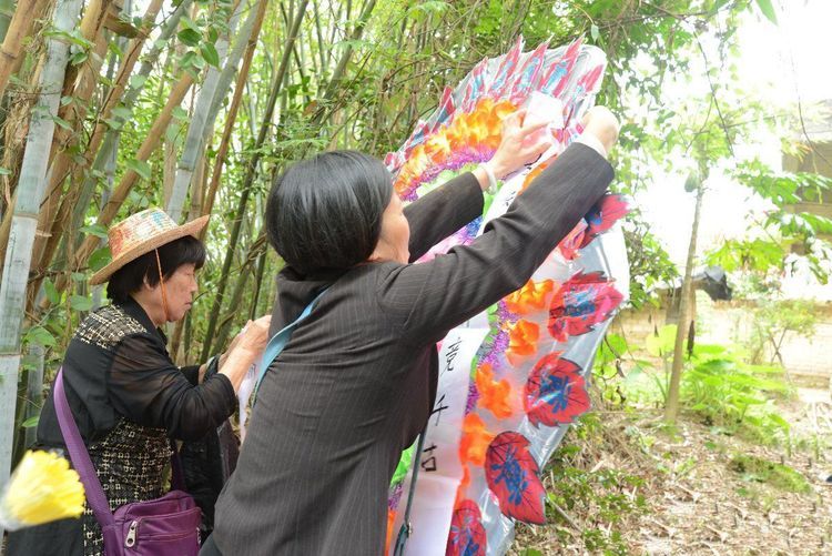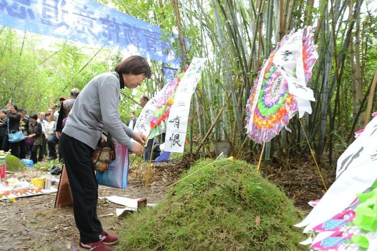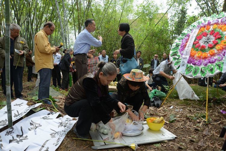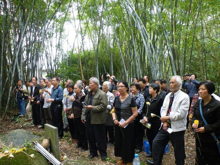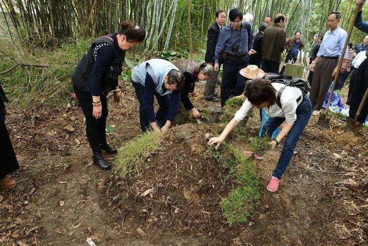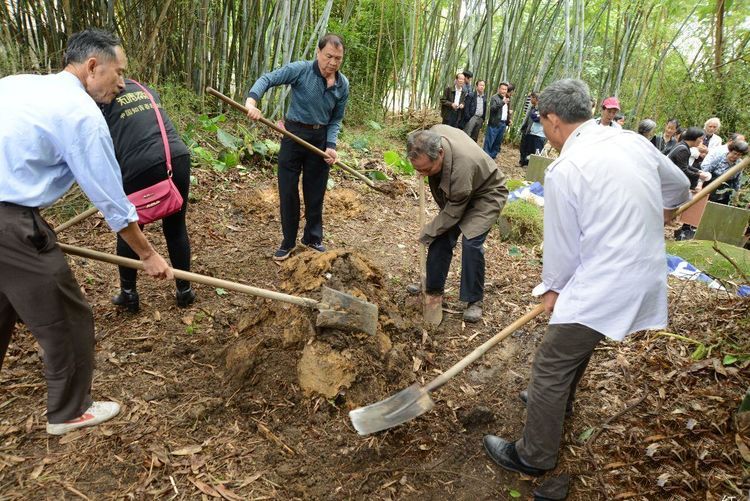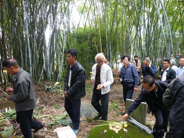 与仙鹤墓园约定的时间将到,根据家属意见挖掘遗骸停止,进行第二方案,在当年被“四类份子”草葬竞子的竹林里棒上黄土一杯,香烛一柱,引“花魂”的车子开往仙鹤墓园为杨伟竞 建立衣冠冢。