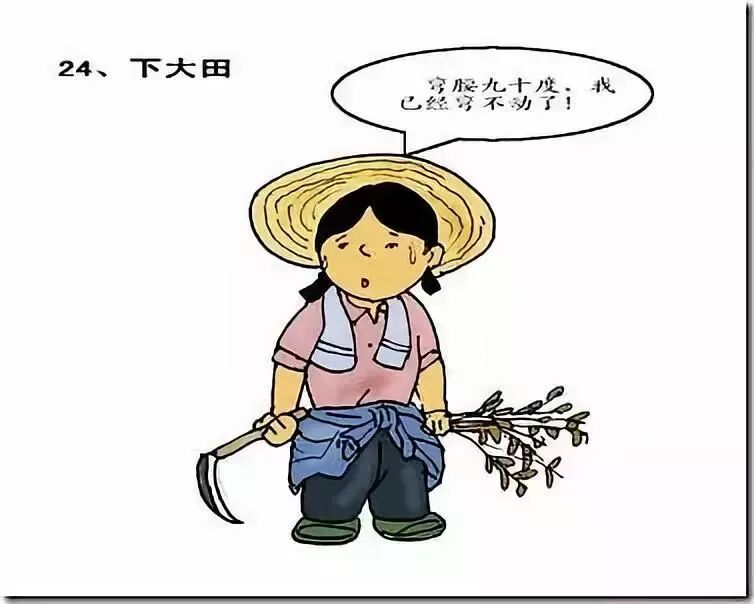 这是最普遍最辛劳的工种。“早上三点半,晚上看不见”,“弯腰九十度,爬行数十里”,形象地描写出下大田者的工作状态。在这劳动大军中,女的占了大部分。