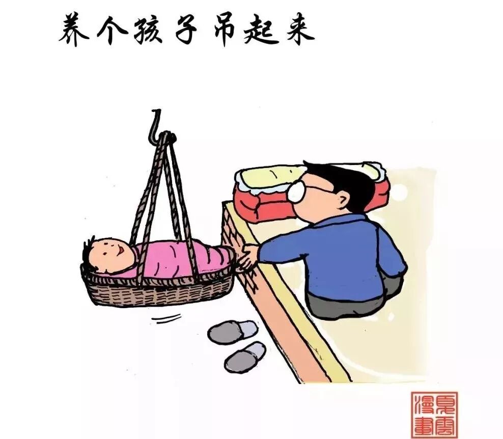 养个孩子吊起来,实际是把婴儿放在悬挂在房梁上的悠车里。据说这是满族的发明。当年东北还很荒凉,不但虫蛇较多,而且屋内烧火炕,婴儿睡这种火炕容易“上火”生病。把婴儿置放在悬空的柳条筐内有节奏晃动,可减少虫蛇叮咬,让孩子睡得更安稳。