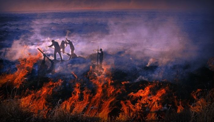 方圆几里的火场烟雾弥漫,风一吹,烧得那树叶、树干、枯草霹霹啪啪作响,大有‘野火烧不尽,春风吹又生’的气势。我和同伴们手握树枝冲向火场,见火就打,刚刚打灭的火被风一吹又撩起火星。不知不觉我们走到两个丘林之间的洼地,里面长的全是一坨一坨的枯草,当地人叫它塔头甸子。