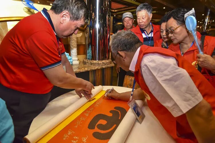 155名与祖国同龄的寿星在“寿”字上用金笔签名留念。