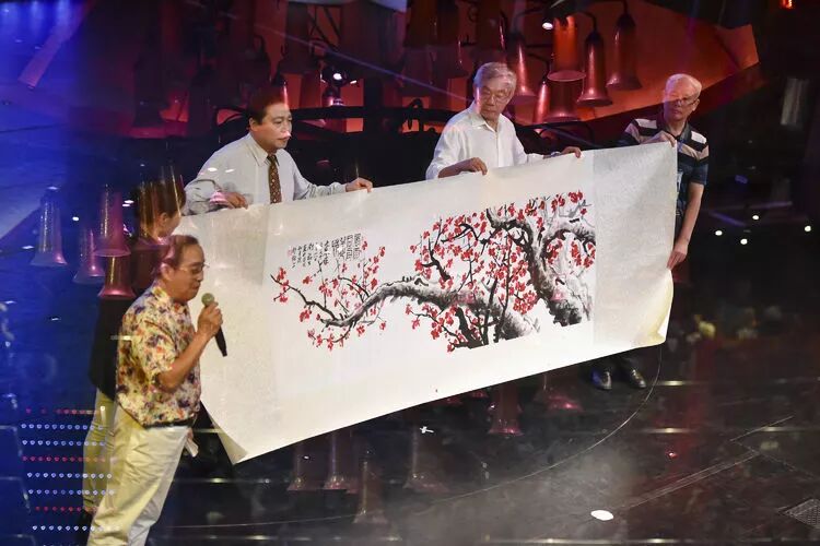 邹小霏介绍"傲骨红梅 雪中绽放"绘画作者:原16团北京知青刘福生, 曾就职中国历史博物馆的著名绘画大师。画面同时并列着铁干横枝、斗雪迎风的腊梅。朵朵怒放的梅花觧红欲滴,那是一千三百名战友的手印生成,看着那怒放的腊梅,眼前闪过的是一代知青的青春容颜、辛勤耕耘、血汗滴滴、闪过是那火中凤凰、振翅欲飞、浴火重生、苍穹、铁干、星空、腊梅、时空交错、激情的泪花飞射……