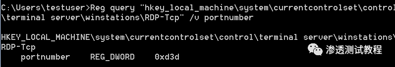Reg query "hkey_local_machine\system\currentcontrolset\control\terminal server\winstations\RDP-Tcp" /v portnumber