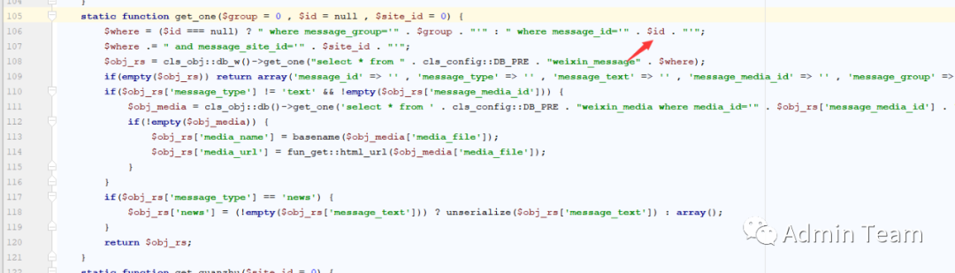 跟进tab_weixin_message::get_one方法,参数$key是我们可控的,参数$site_id无关紧要